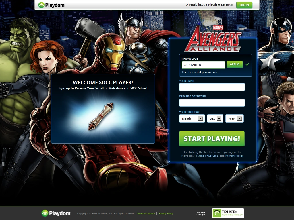 - This Gear along with 5,000 Silver could be obtained by newer players of the Playdom.com version of the game by entering the promo code "GETSTARTED" on http://www.playdom.com/marvelsdcc as a promo Item in San Diego Comic Con 2013.